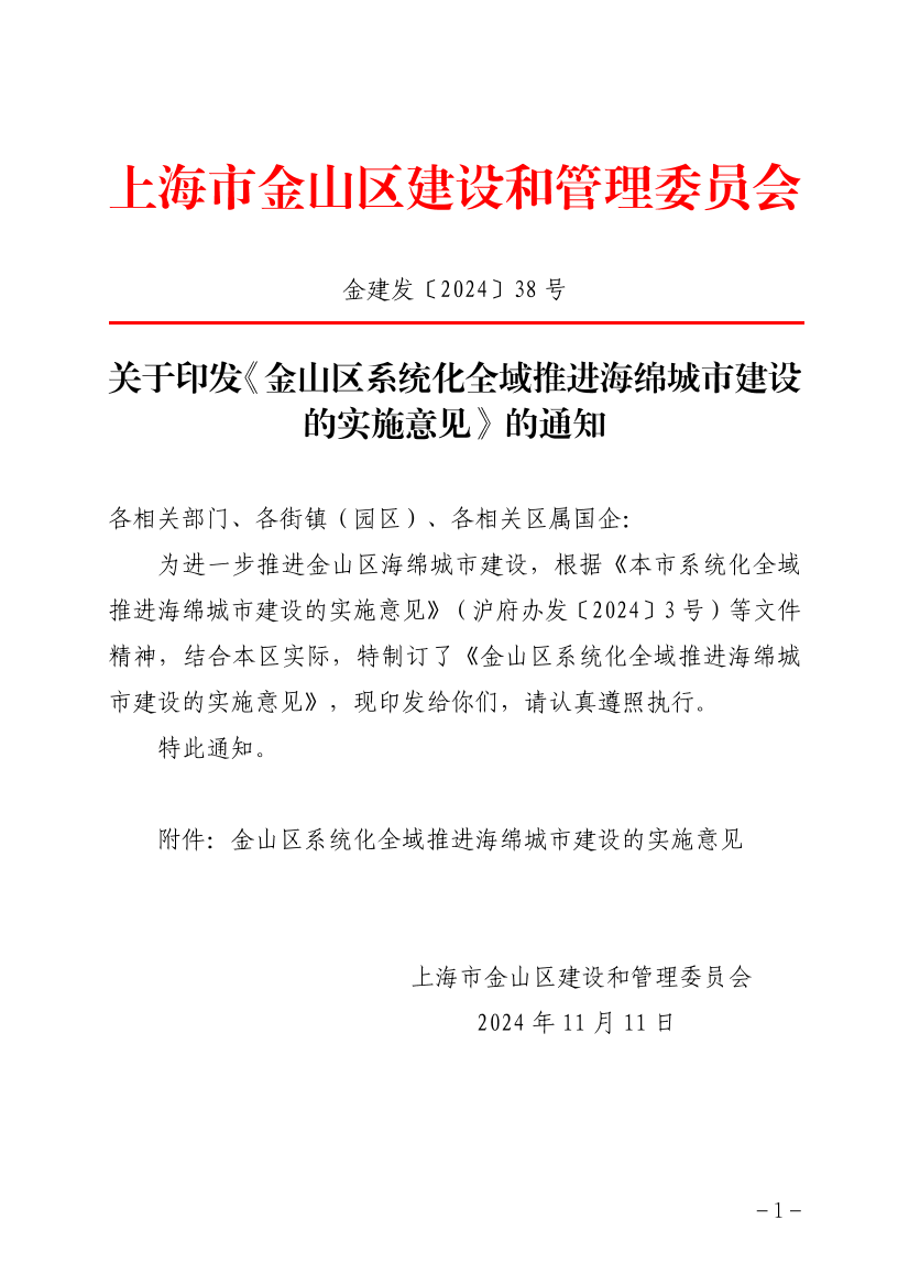 为进一步推进金山区海绵城市建设,根据《本市系统化全域推进海绵城市建设的实施意见》(沪府办发〔2024〕3号)等文件精神,结合本区实际,特制订了《金山区系统化全域推进海绵城市建设的实施意见》,现印发给你们,请认真遵照执行。
