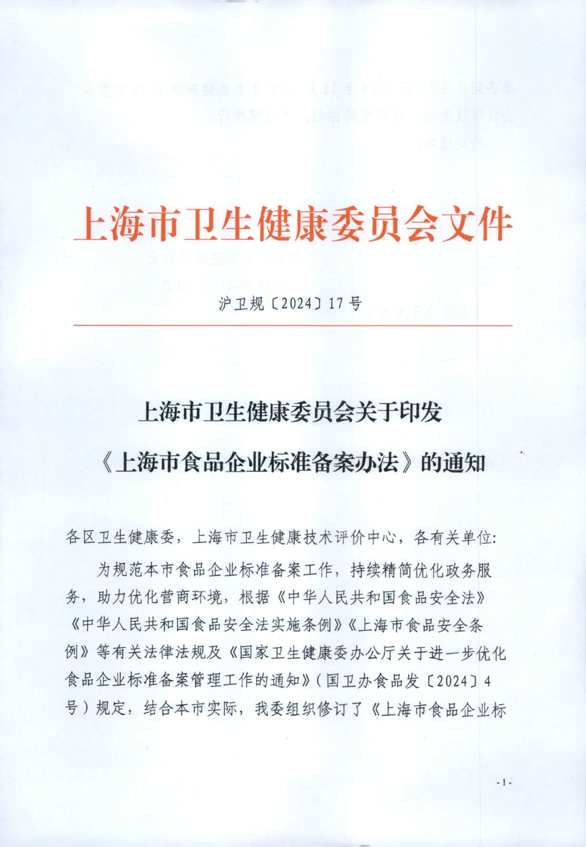 为规范本市食品企业标准备案工作,持续精简优化政务服务,助力优化营商环境,根据《中华人民共和国食品安全法》《中华人民共和国食品安全法实施条例》《上海市食品安全条例》等有关法律法规及《国家卫生健康委办公厅关于进一步优化食品企业标准备案管理工作的通知》(国卫办食品发〔2024〕4号)规定,结合本市实际,我委组织修订了《上海市食品企业标准备案办法》,经2024年11月15日市卫生健康委第70次委务会议审议通过,现印发给你们,请遵照执行。
