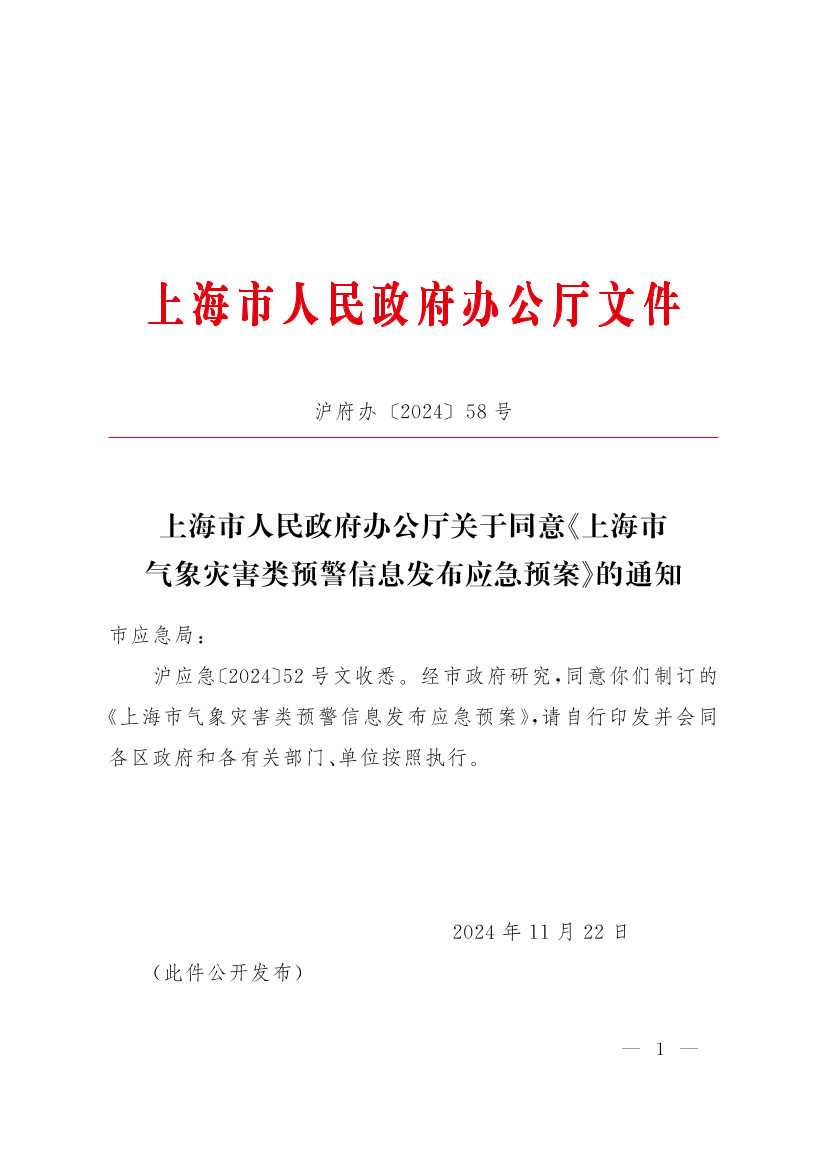 沪应急〔2024〕52号文收悉。经市政府研究,同意你们制订的《上海市气象灾害类预警信息发布应急预案》,请自行印发并会同各区政府和各有关部门、单位按照执行。