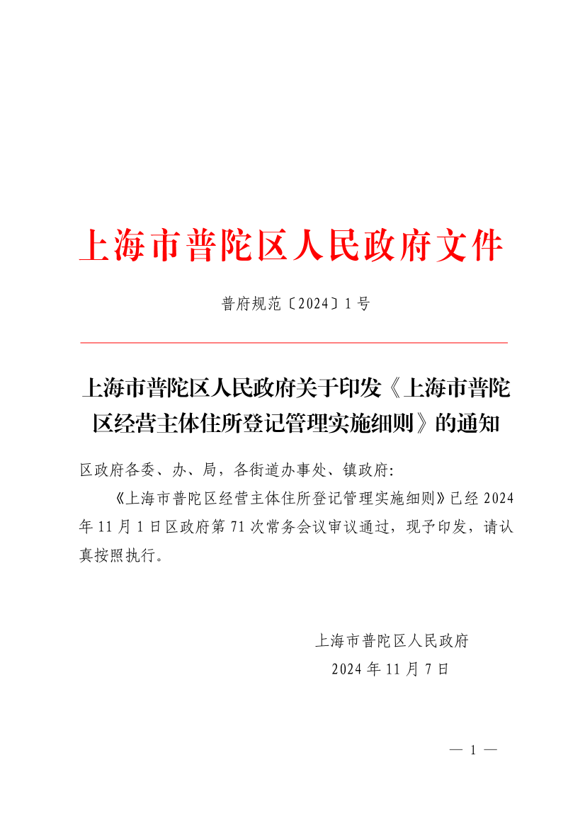 《上海市普陀区经营主体住所登记管理实施细则》已经2024年11月1日区政府第71次常务会议审议通过,现予印发,请认真按照执行。