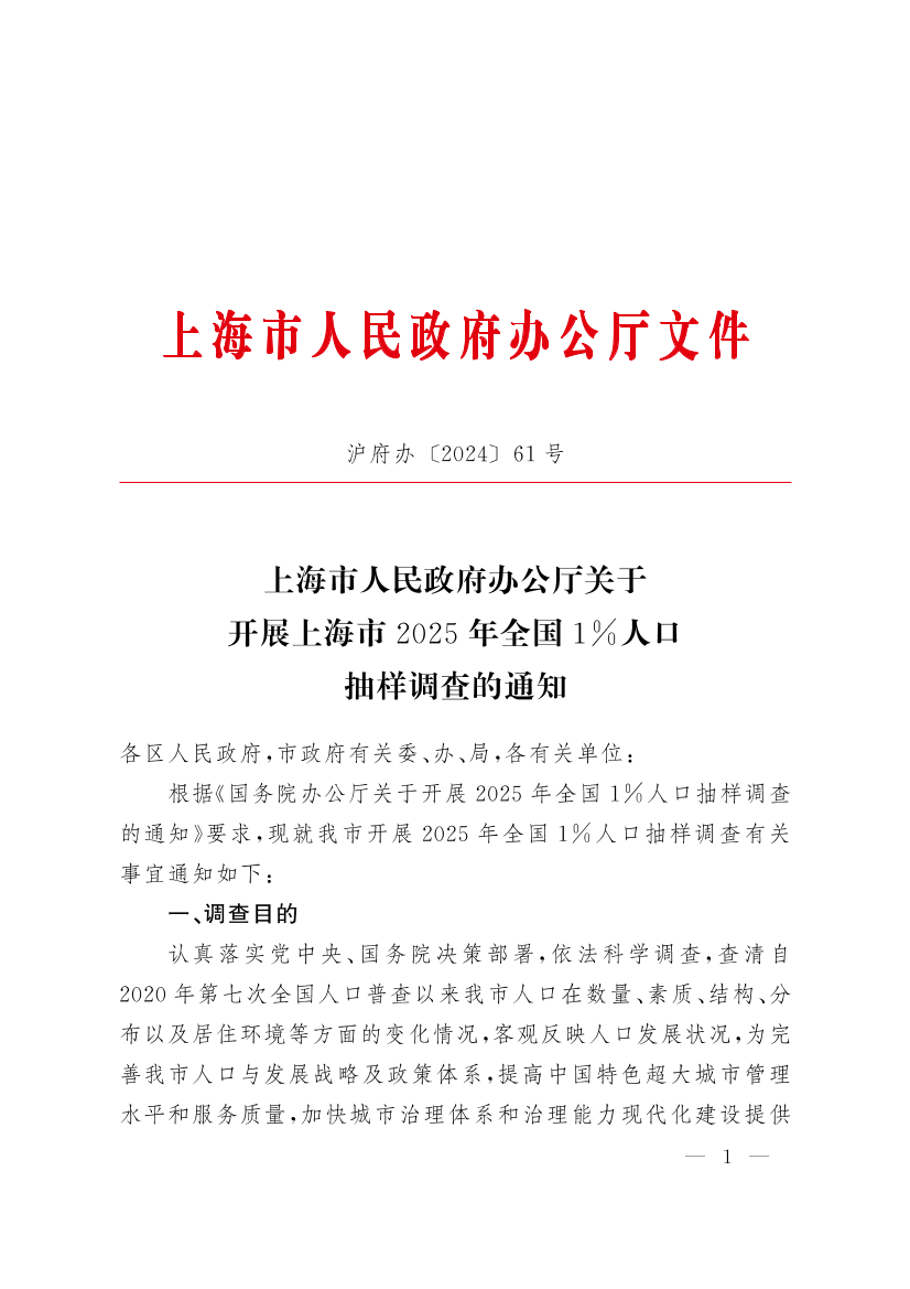 上海市人民政府办公厅关于开展上海市2025年全国1%人口抽样调查的通知