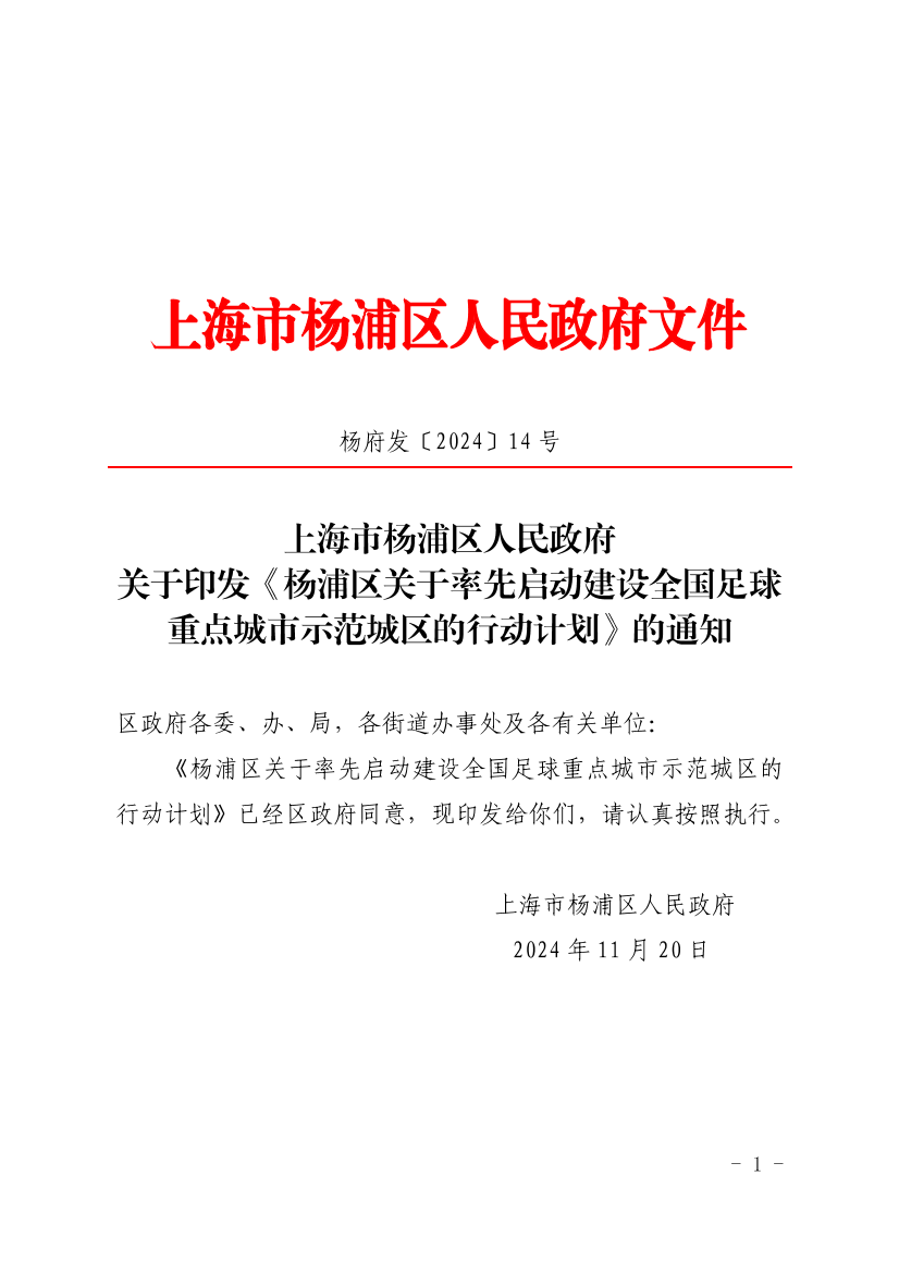 《杨浦区关于率先启动建设全国足球重点城市示范城区的行动计划》已经区政府同意,现印发给你们,请认真按照执行。
