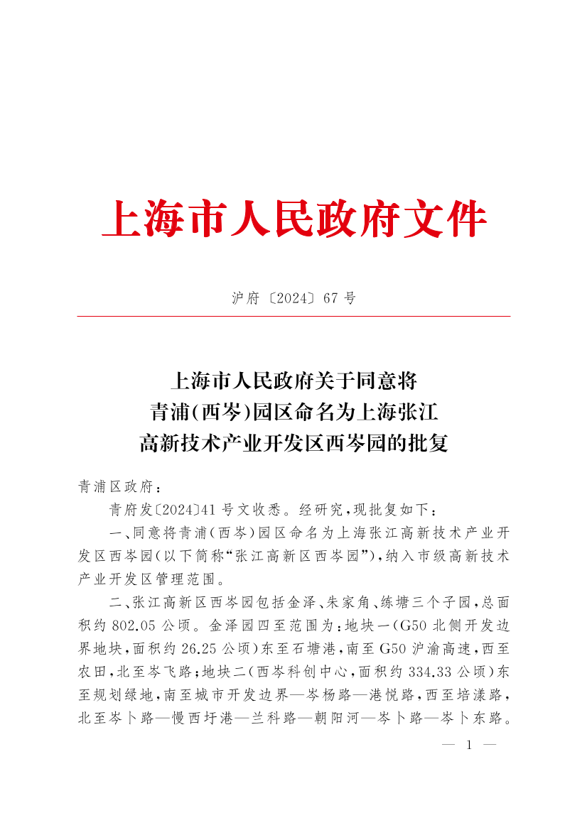 一、同意将青浦(西岑)园区命名为上海张江高新技术产业开发区西岑园(以下简称“张江高新区西岑园”),纳入市级高新技术产业开发区管理范围。