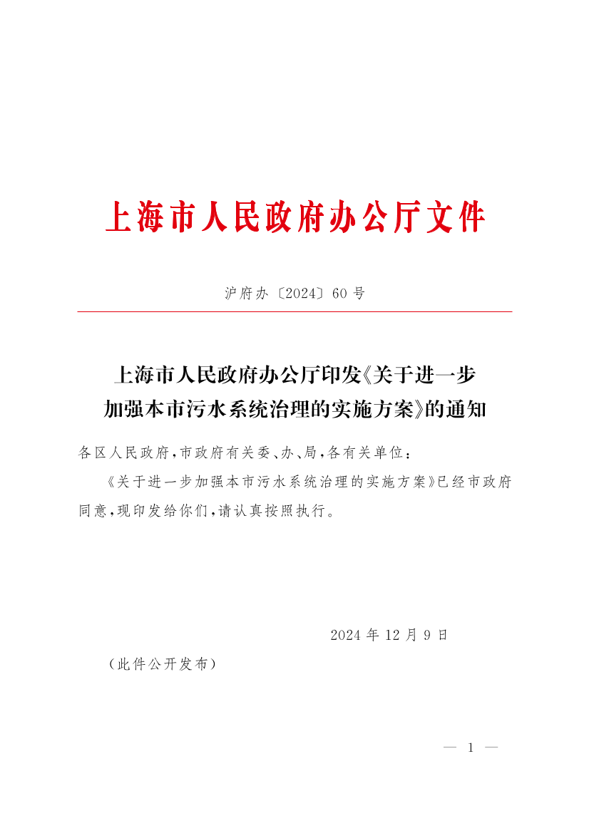 上海市人民政府办公厅印发《关于进一步加强本市污水系统治理的实施方案》的通知