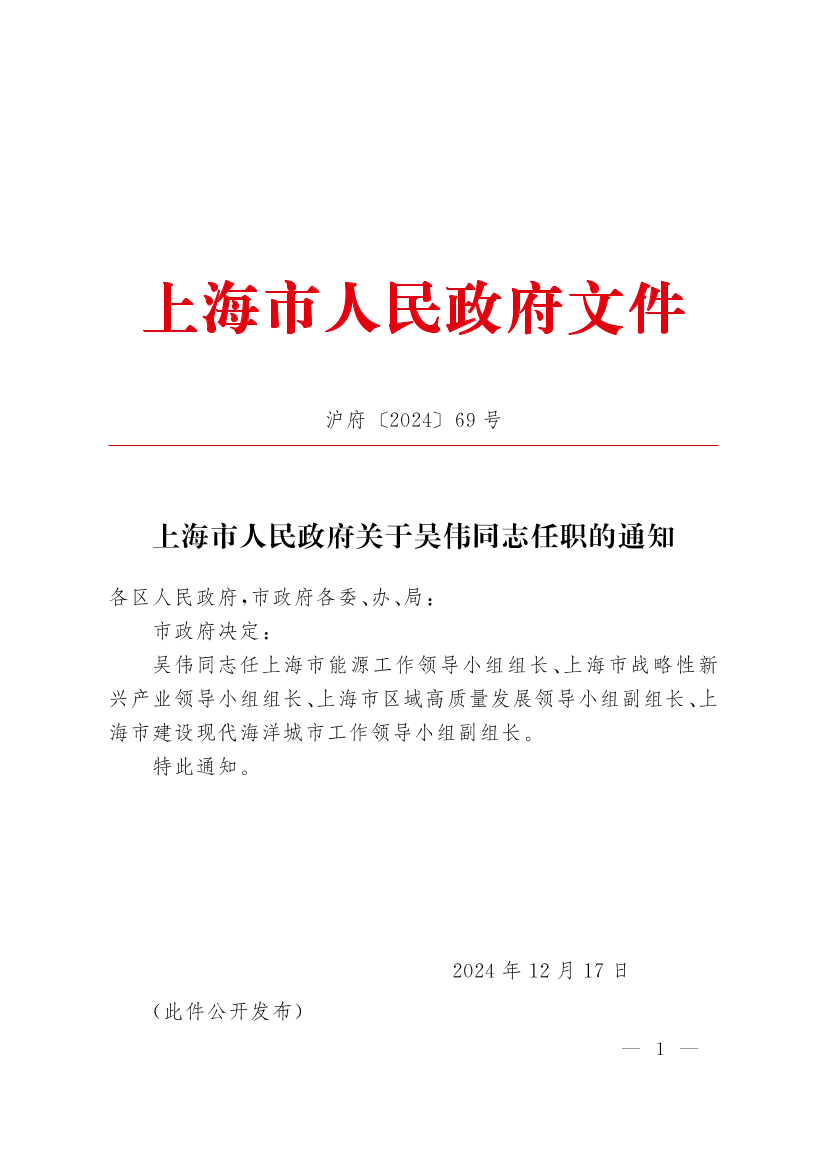 吴伟同志任上海市能源工作领导小组组长、上海市战略性新兴产业领导小组组长、上海市区域高质量发展领导小组副组长、上海市建设现代海洋城市工作领导小组副组长。