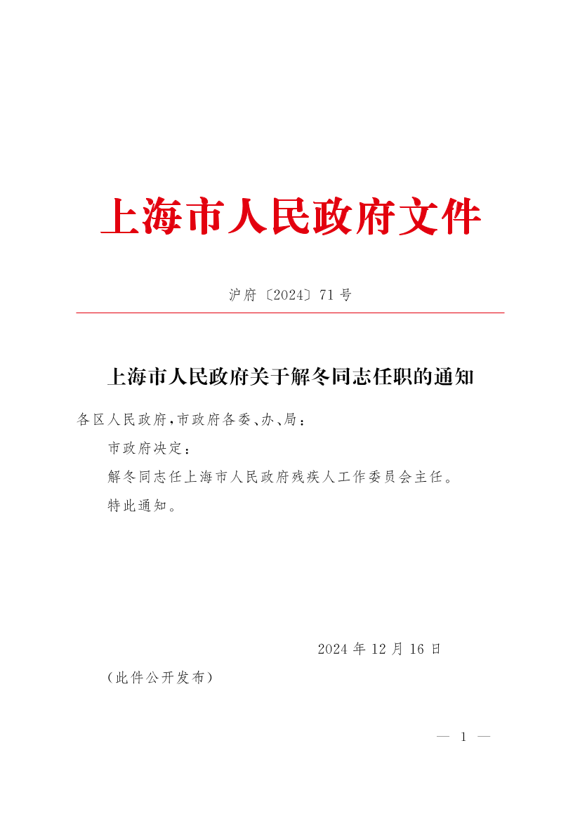 解冬同志任上海市人民政府残疾人工作委员会主任。