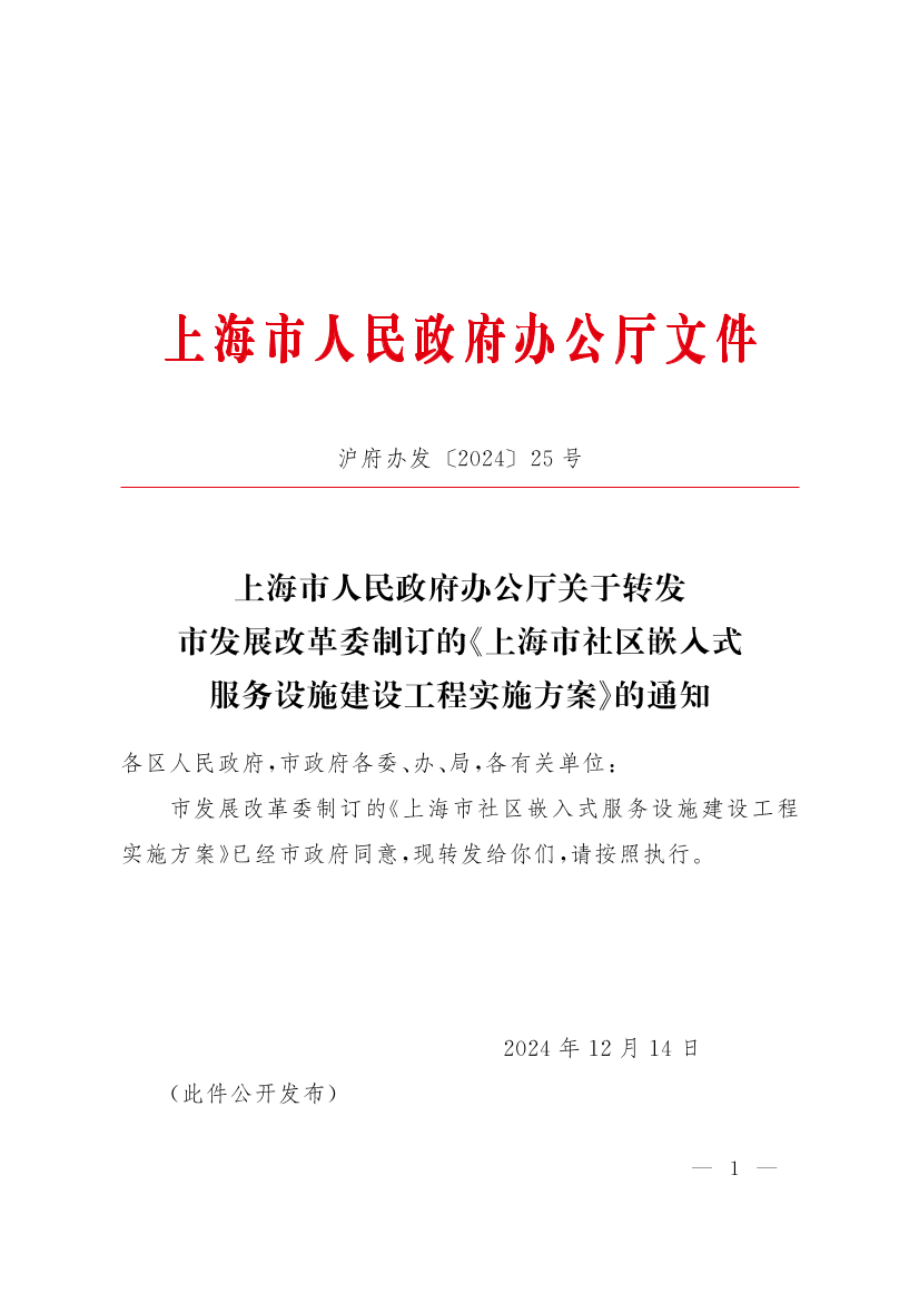 市发展改革委制订的《上海市社区嵌入式服务设施建设工程实施方案》已经市政府同意,现转发给你们,请按照执行。