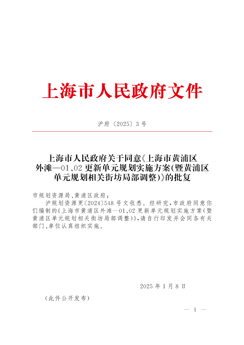 沪规划资源更〔2024〕548号文收悉。经研究,市政府同意你们编制的《上海市黄浦区外滩—01、02更新单元规划实施方案(暨黄浦区单元规划相关街坊局部调整)》,请自行印发并会同各有关部门、单位认真组织实施。