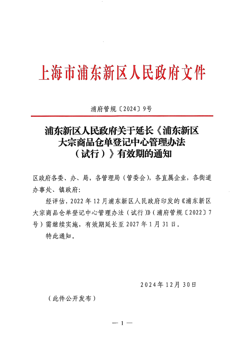 经评估,2022年12月浦东新区人民政府印发的《浦东新区大宗商品仓单登记中心管理办法(试行)》(浦府管规〔2022〕7号)需继续实施,有效期延长至2027年1月31日。