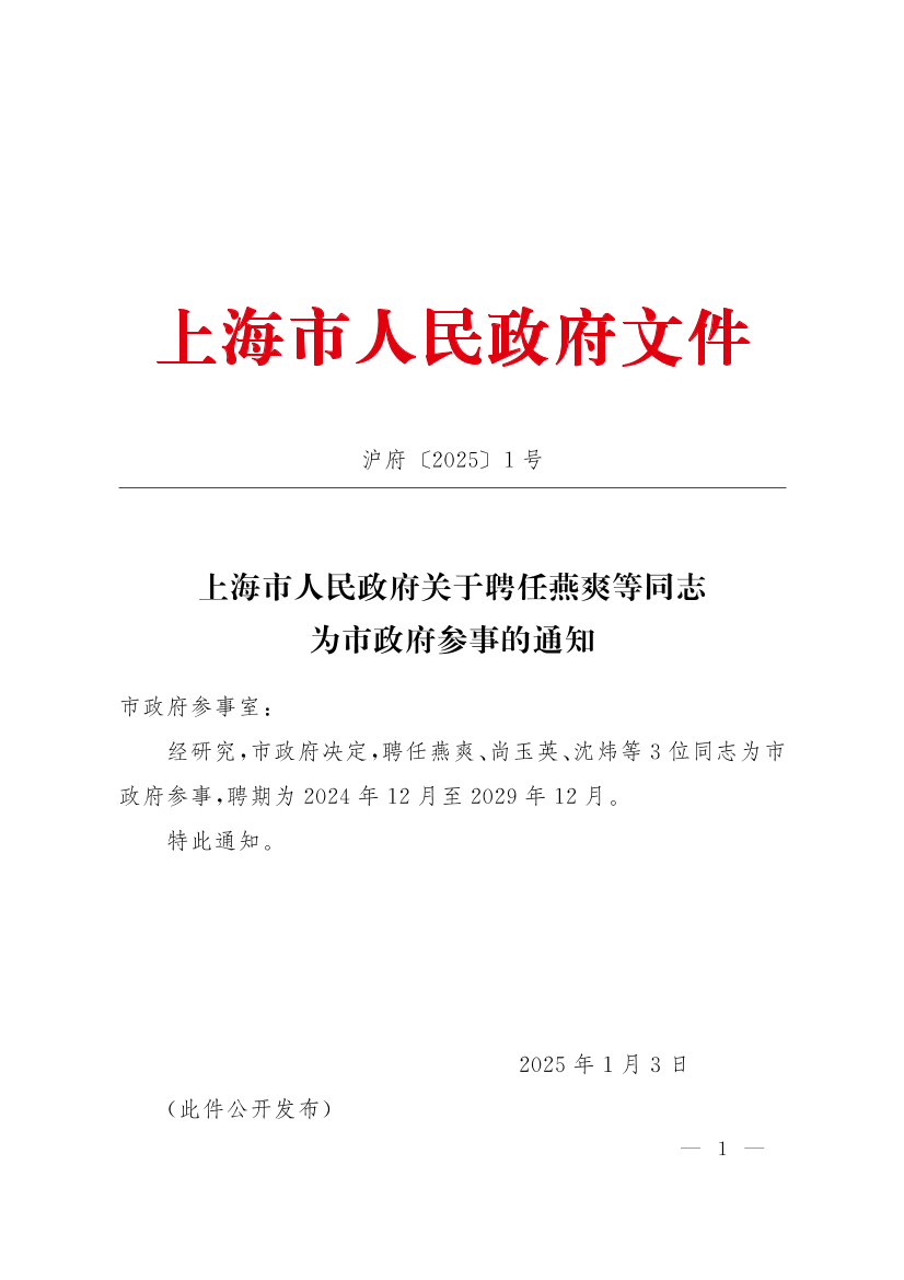 经研究,市政府决定,聘任燕爽、尚玉英、沈炜等3位同志为市政府参事,聘期为2024年12月至2029年12月。