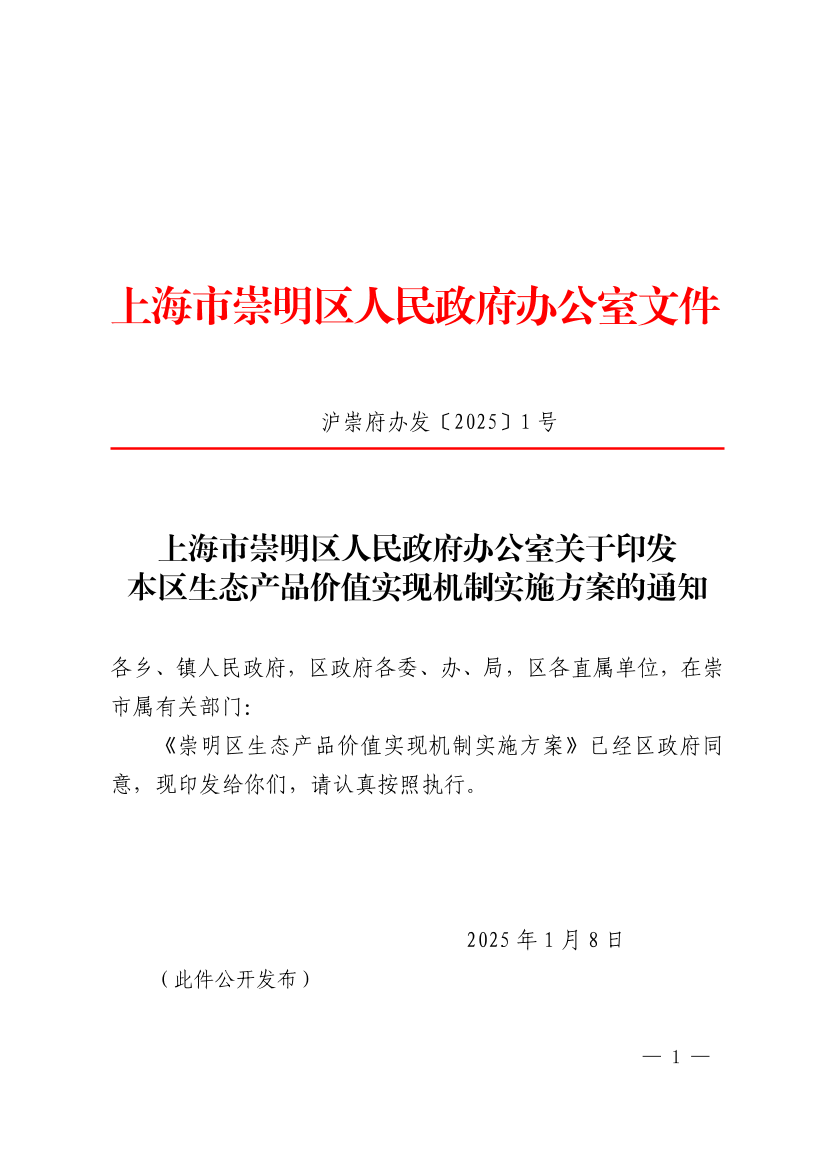 《崇明区生态产品价值实现机制实施方案》已经区政府同意,现印发给你们,请认真按照执行。