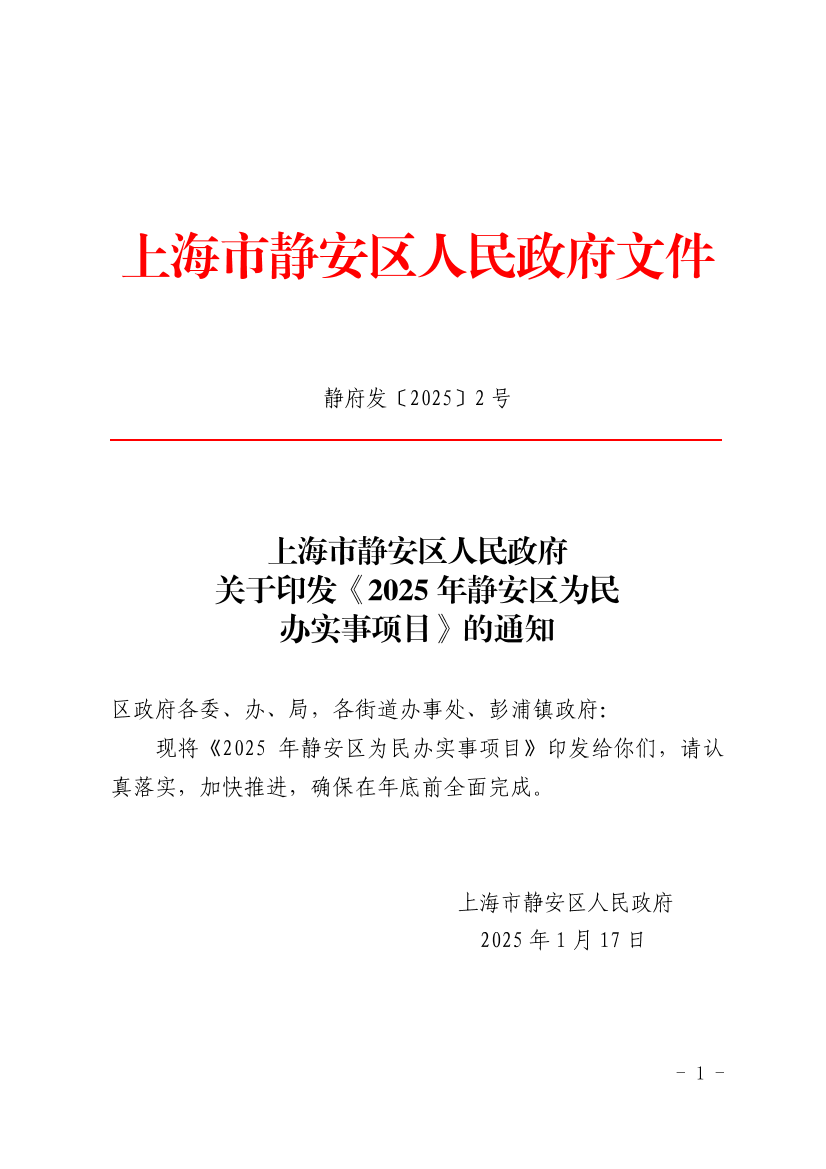现将《2025年静安区为民办实事项目》印发给你们,请认真落实,加快推进,确保在年底前全面完成。