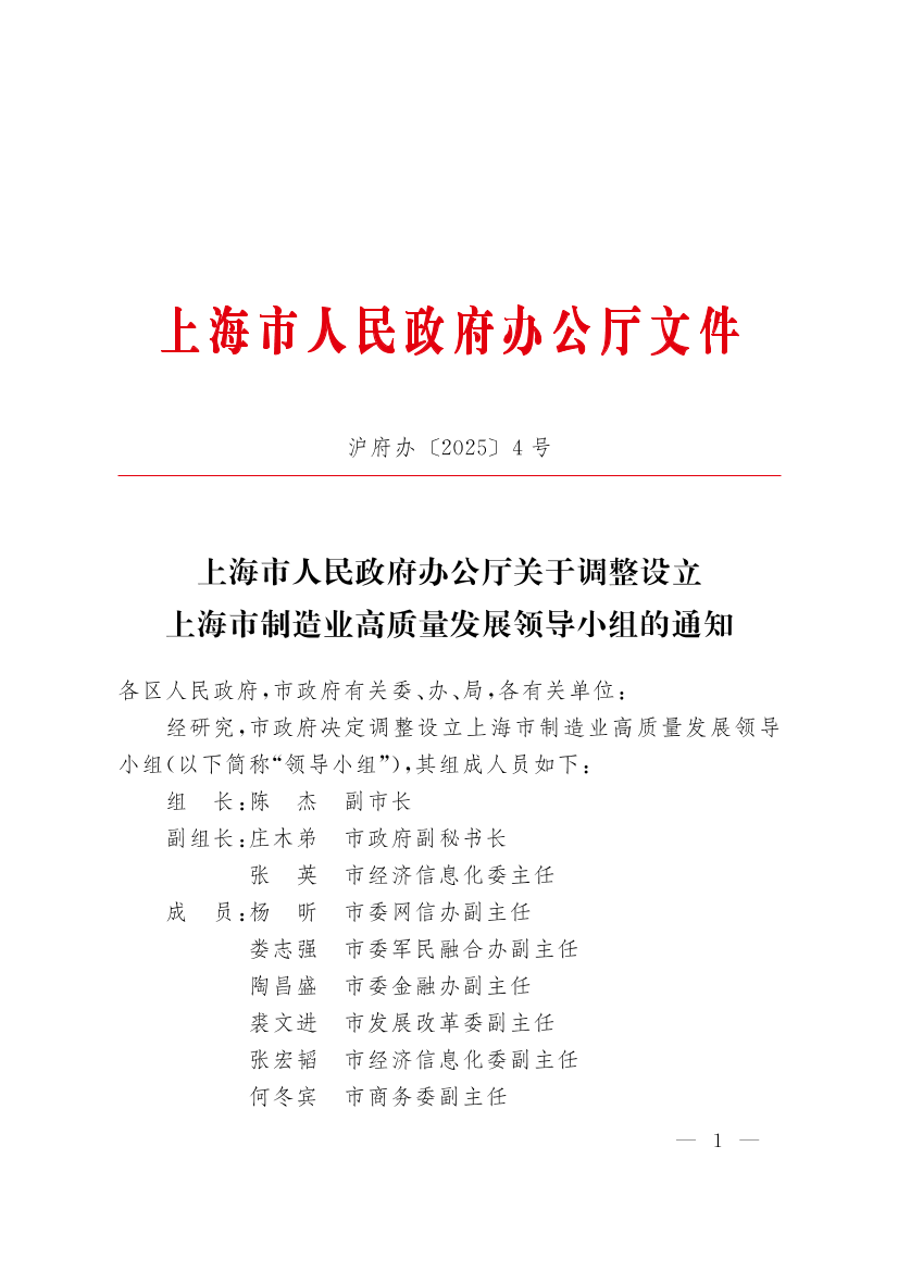 经研究,市政府决定调整设立上海市制造业高质量发展领导小组(以下简称“领导小组”),其组成人员如下: