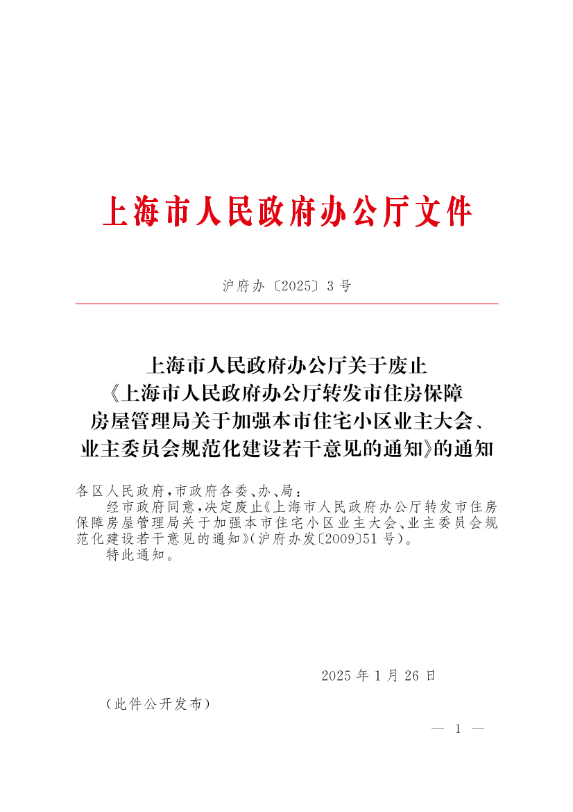 经市政府同意,决定废止《上海市人民政府办公厅转发市住房保障房屋管理局关于加强本市住宅小区业主大会、业主委员会规范化建设若干意见的通知》(沪府办发〔2009〕51号)。