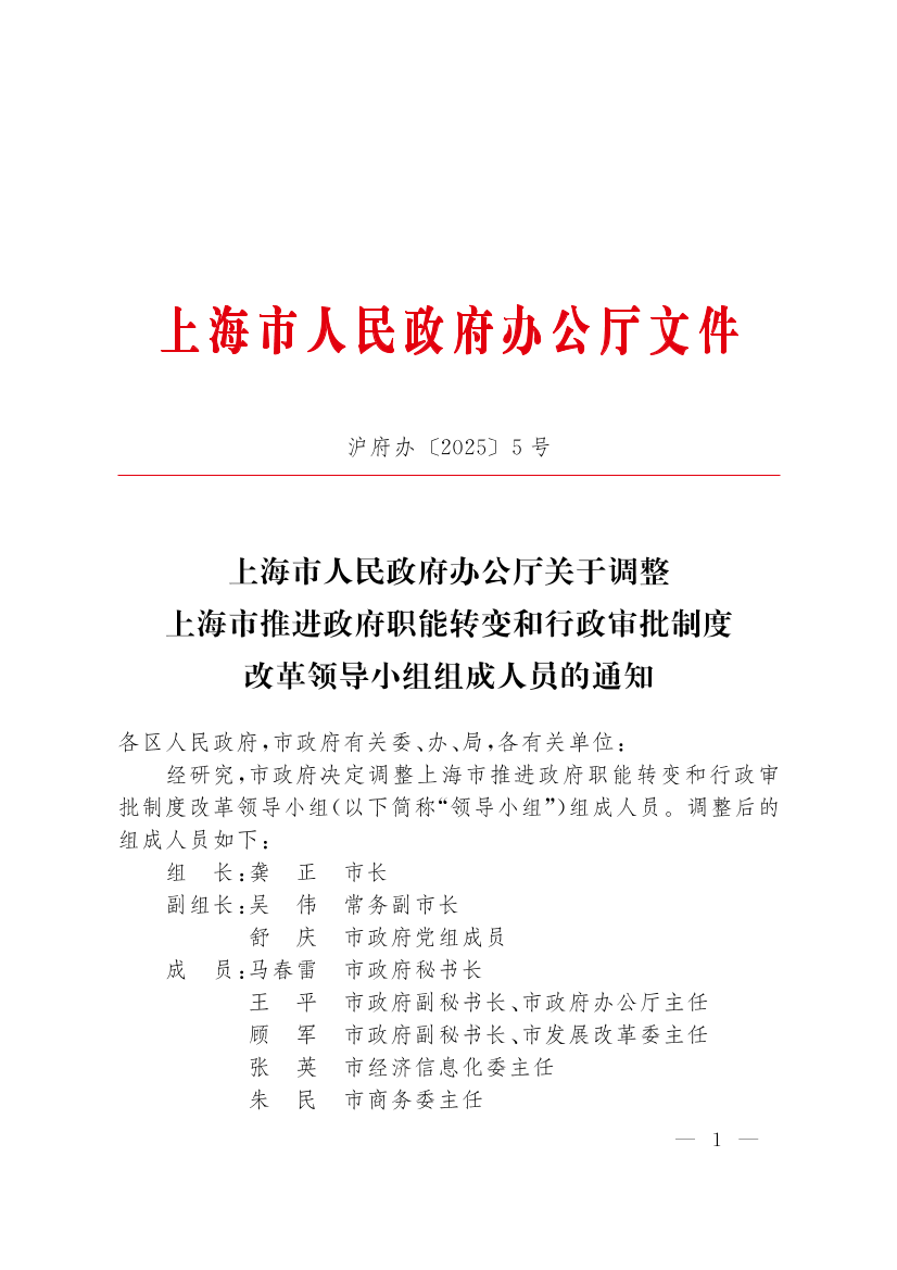 经研究,市政府决定调整上海市推进政府职能转变和行政审批制度改革领导小组(以下简称“领导小组”)组成人员。调整后的组成人员如下: