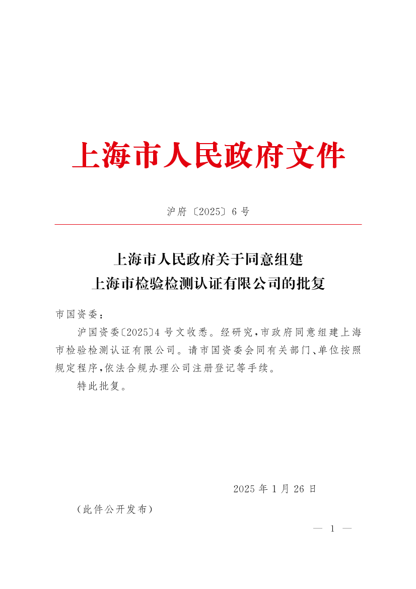 沪国资委〔2025〕4号文收悉。经研究,市政府同意组建上海市检验检测认证有限公司。请市国资委会同有关部门、单位按照规定程序,依法合规办理公司注册登记等手续。