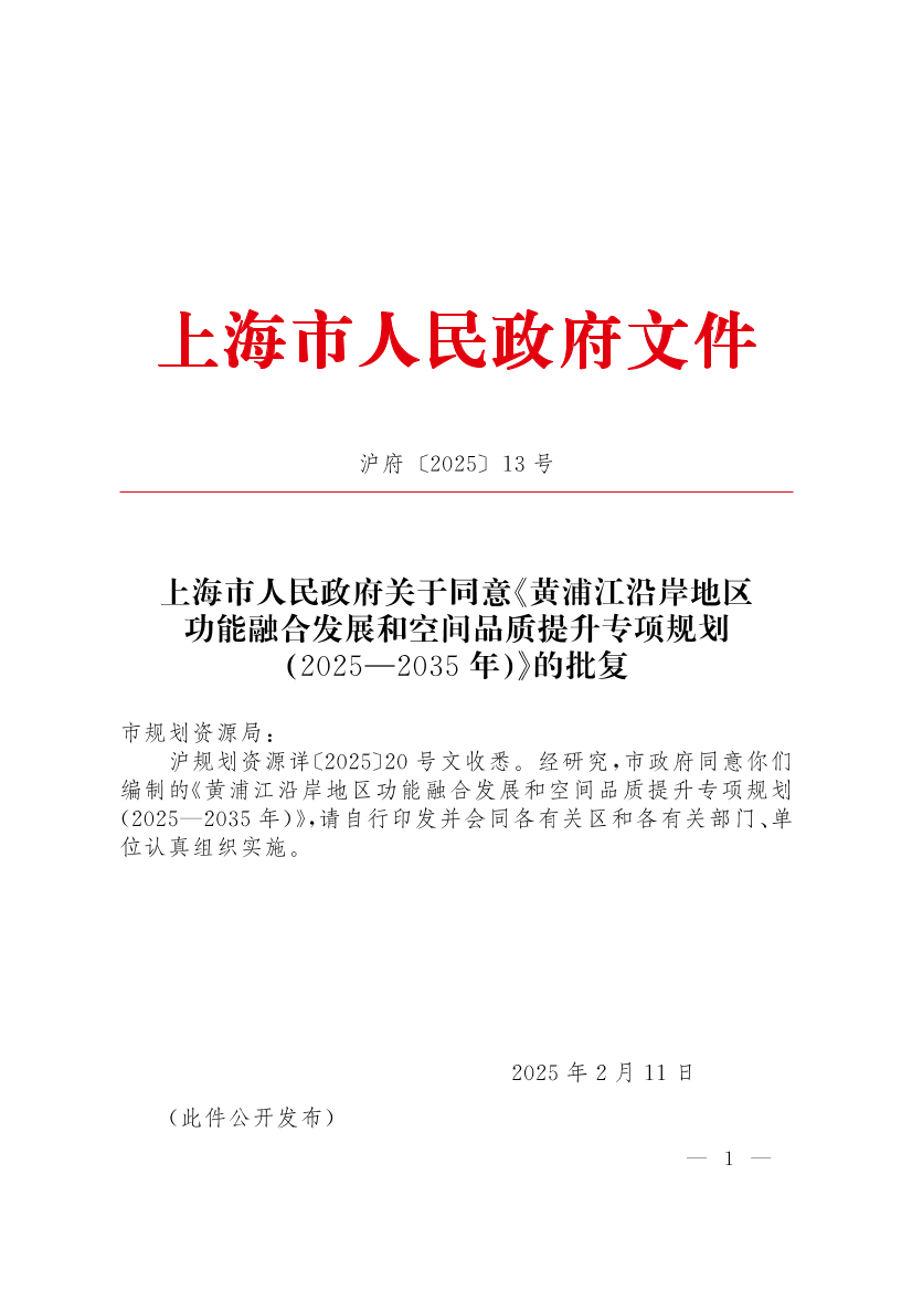 上海市人民政府关于同意《黄浦江沿岸地区功能融合发展和空间品质提升专项规划(2025—2035年)》的批复