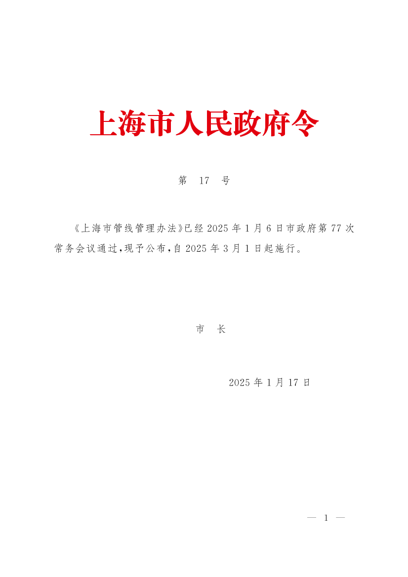 《上海市管线管理办法》已经2025年1月6日市政府第77次常务会议通过,现予公布,自2025年3月1日起施行。