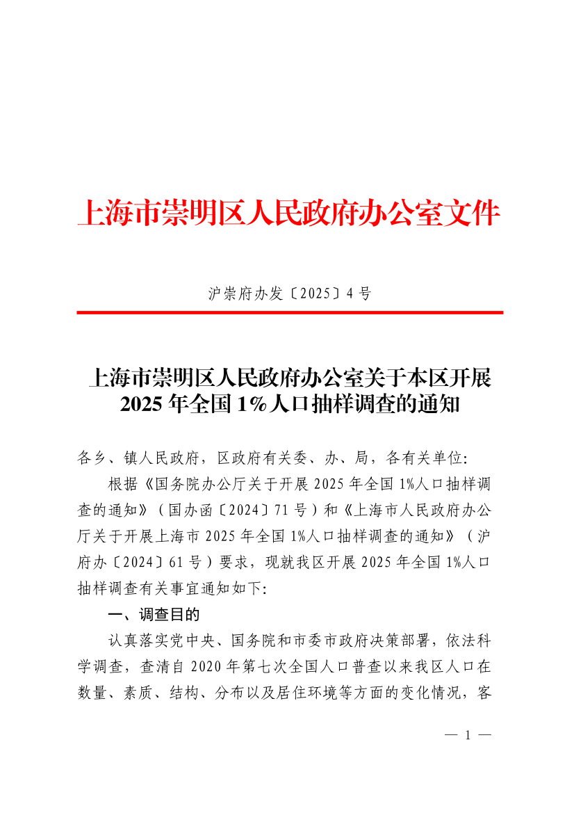 崇明区人民政府办公室关于本区开展2025年全国1%人口抽样调查的通知