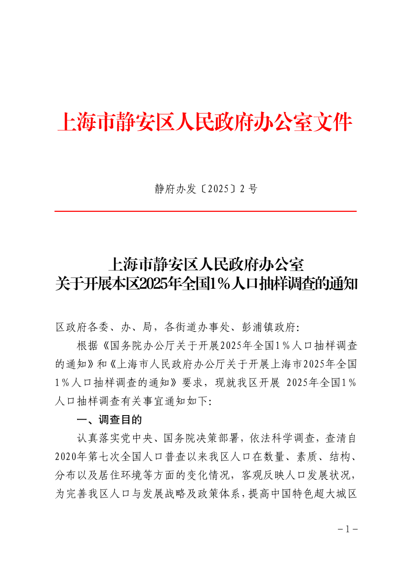 静安区人民政府办公室关于开展本区2025年全国1%人口抽样调查的通知