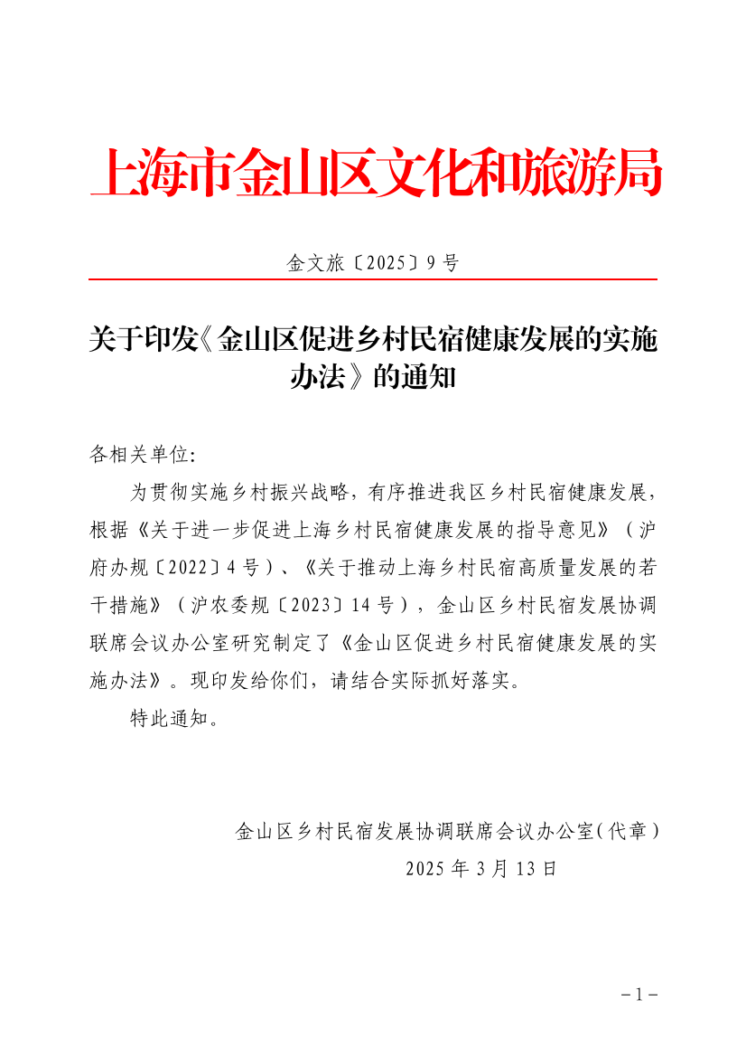 关于印发《金山区促进乡村民宿健康发展的实施办法》的通知