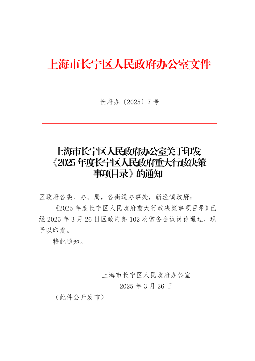 关于印发《2025年度长宁区人民政府重大行政决策事项目录》的通知