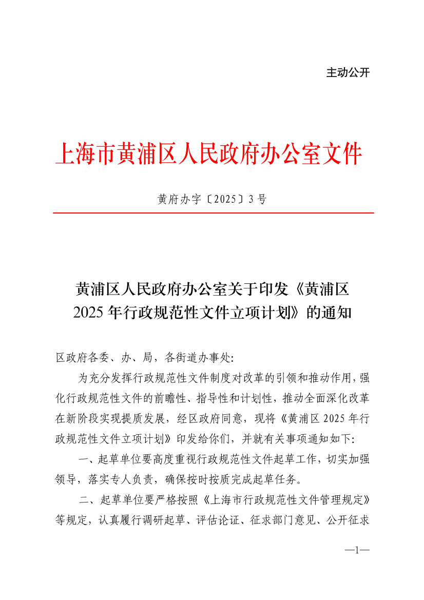 为充分发挥行政规范性文件制度对改革的引领和推动作用,强化行政规范性文件的前瞻性、指导性和计划性,推动全面深化改革在新阶段实现提质发展,经区政府同意,现将《黄浦区2025年行政规范性文件立项计划》印发给你们,并就有关事项通知如下: