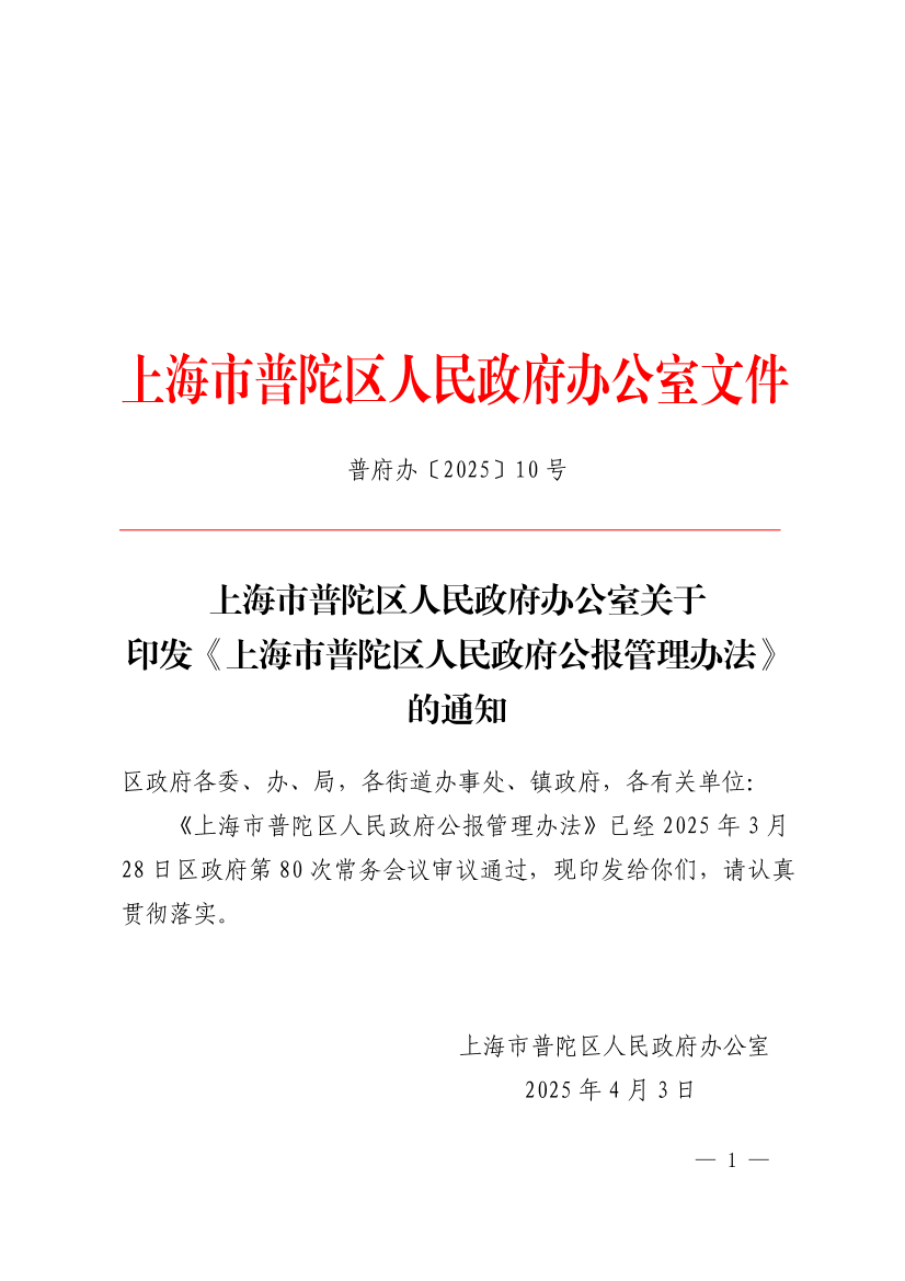 《上海市普陀区人民政府公报管理办法》已经2025年3月28日区政府第80次常务会议审议通过,现印发给你们,请认真贯彻落实。