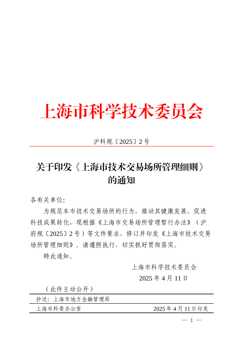 为规范本市技术交易场所的行为,推动其健康发展,促进科技成果转化,现根据《上海市交易场所管理暂行办法》(沪府规〔2025〕2号)等文件要求,修订并印发《上海市技术交易场所管理细则》。请遵照执行,切实抓好贯彻落实。