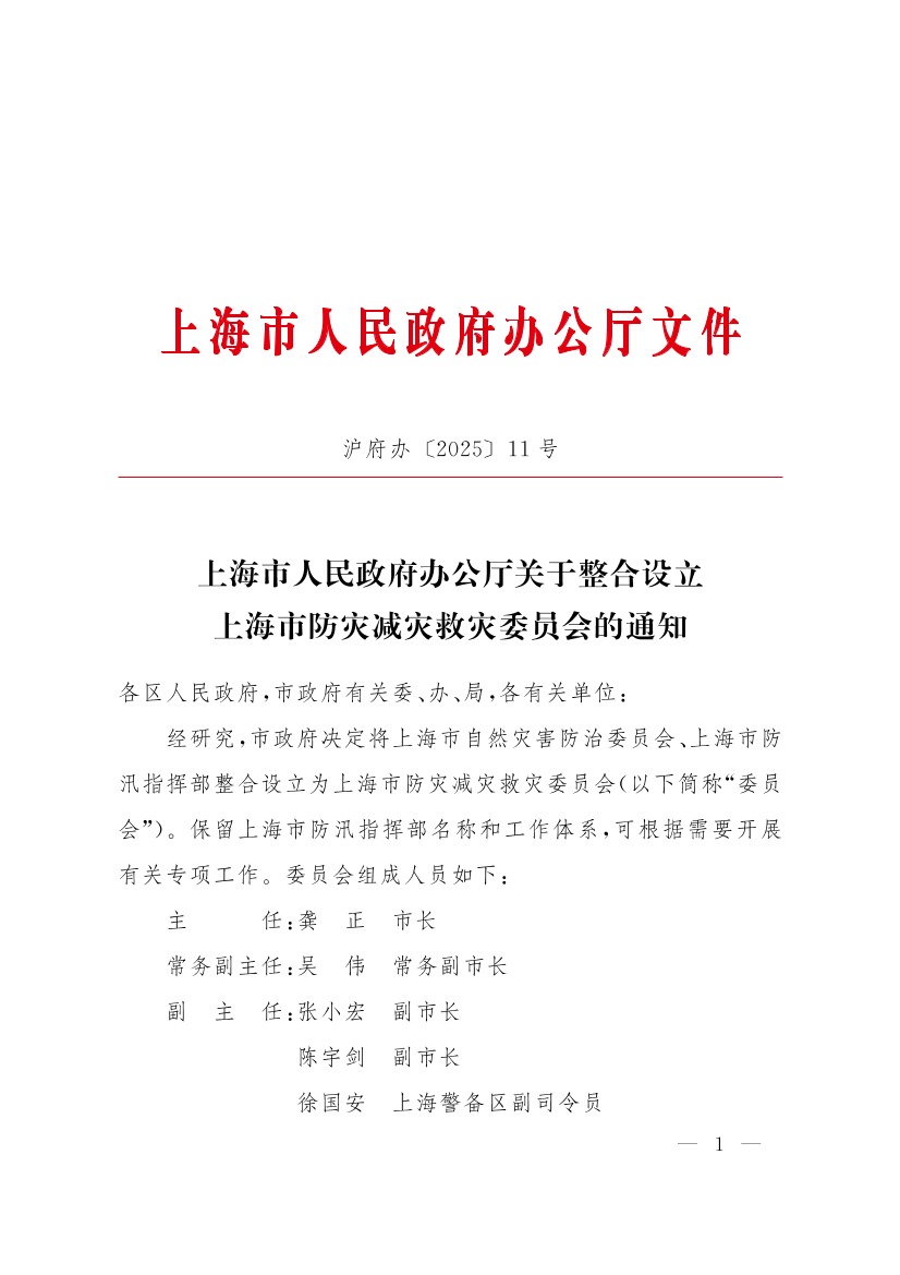 经研究,市政府决定将上海市自然灾害防治委员会、上海市防汛指挥部整合设立为上海市防灾减灾救灾委员会(以下简称“委员会”)。保留上海市防汛指挥部名称和工作体系,可根据需要开展有关专项工作。委员会组成人员如下: