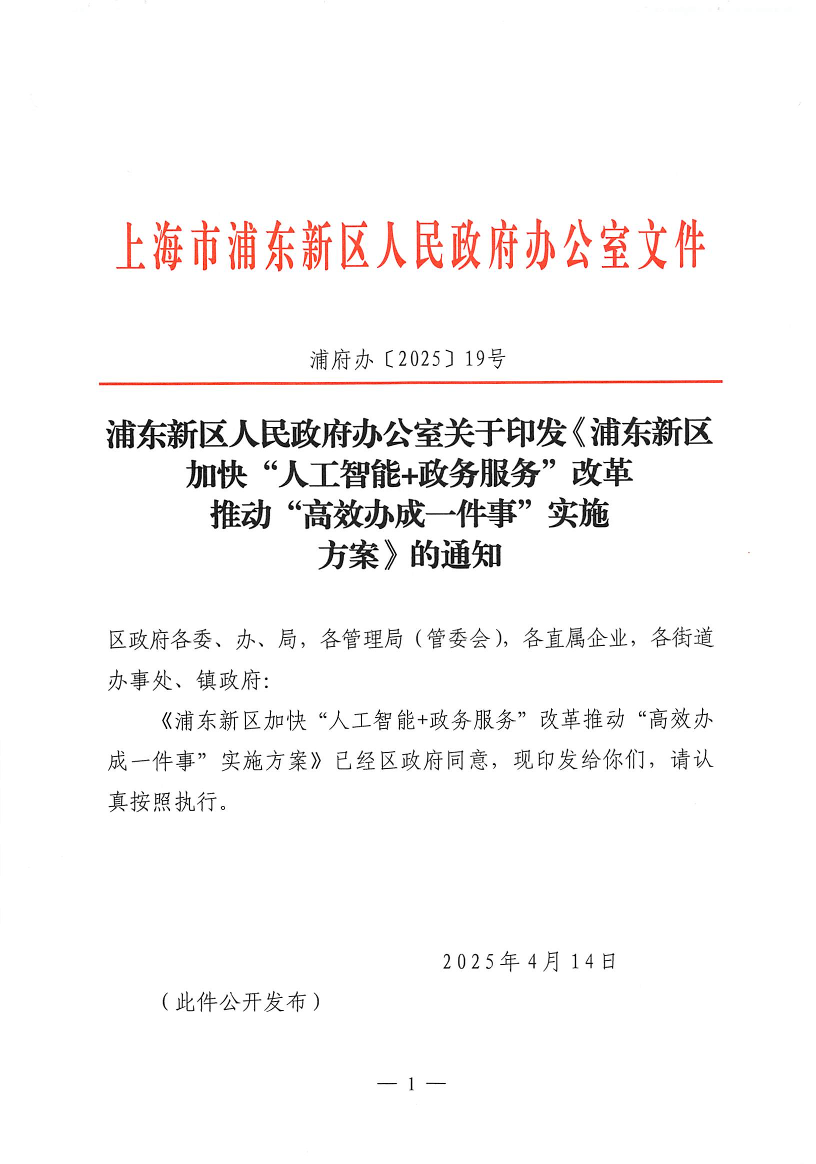关于印发《浦东新区加快“人工智能+政务服务”改革推动“高效办成一件事”实施方案》的通知