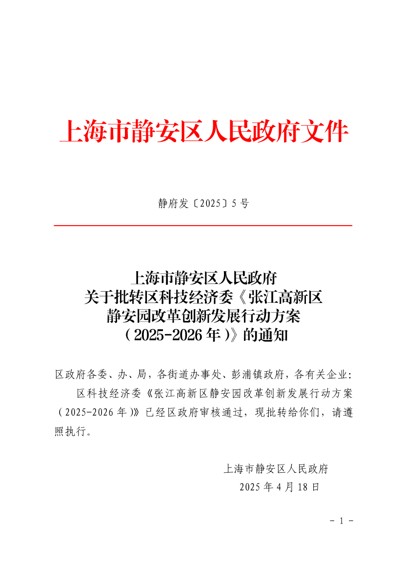 区科技经济委《张江高新区静安园改革创新发展行动方案(2025-2026年)》已经区政府审核通过,现批转给你们,请遵照执行。