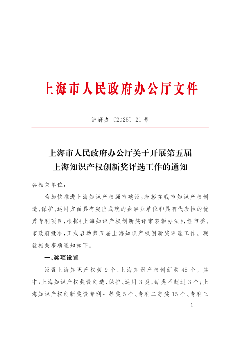 为加快推进上海知识产权强市建设,表彰在我市知识产权创造、保护、运用方面具有突出成就的企事业单位和具有代表性的优秀专利项目,根据《上海知识产权创新奖评审表彰办法》,经市委、市政府批准,正式启动第五届上海知识产权创新奖评选工作。现就相关事项通知如下: