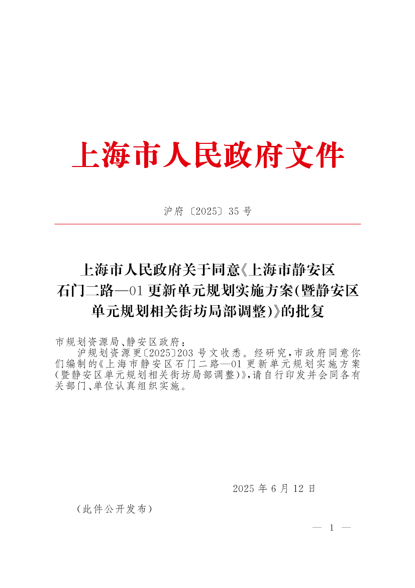 沪规划资源更〔2025〕203号文收悉。经研究,市政府同意你们编制的《上海市静安区石门二路—01更新单元规划实施方案(暨静安区单元规划相关街坊局部调整)》,请自行印发并会同各有关部门、单位认真组织实施。
