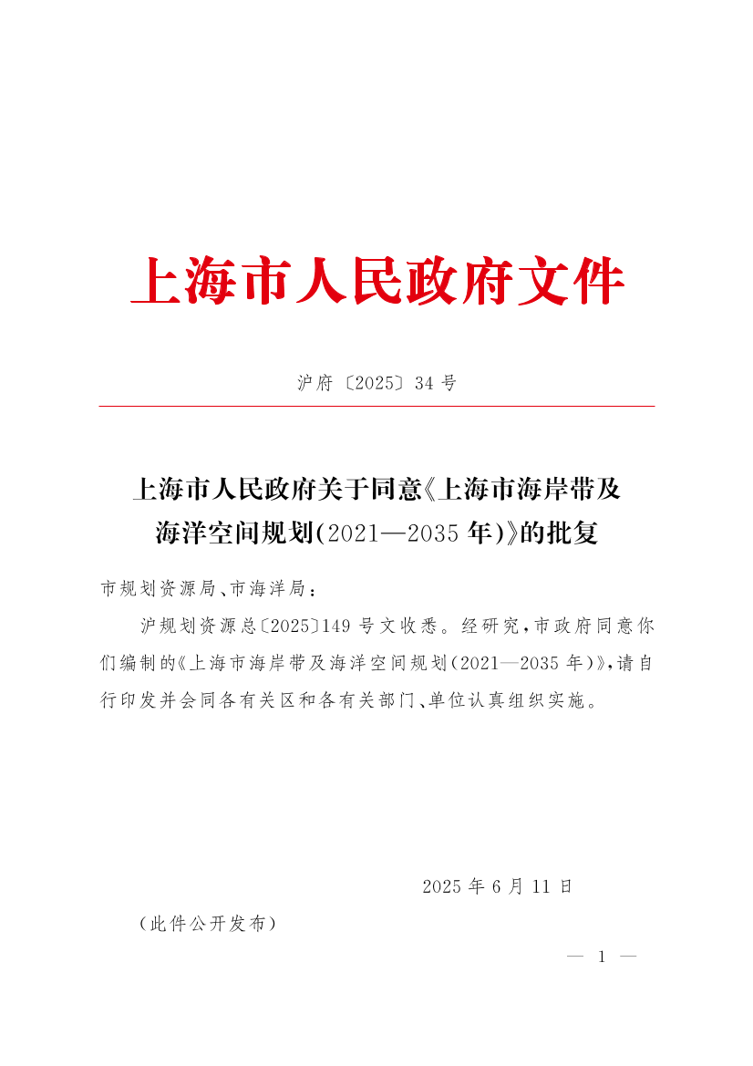 沪规划资源总〔2025〕149号文收悉。经研究,市政府同意你们编制的《上海市海岸带及海洋空间规划(2021—2035年)》,请自行印发并会同各有关区和各有关部门、单位认真组织实施。