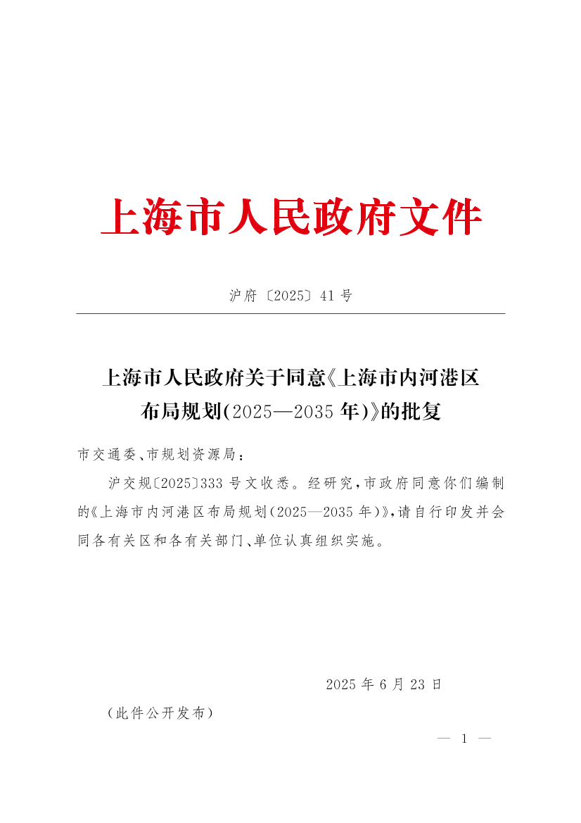 沪交规〔2025〕333号文收悉。经研究,市政府同意你们编制的《上海市内河港区布局规划(2025—2035年)》,请自行印发并会同各有关区和各有关部门、单位认真组织实施。