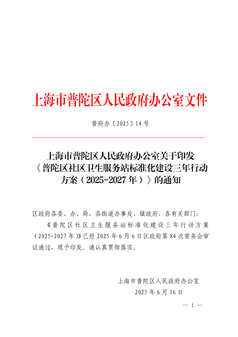 关于印发《普陀区社区卫生服务站标准化建设三年行动方案(2025-2027年)》的通知