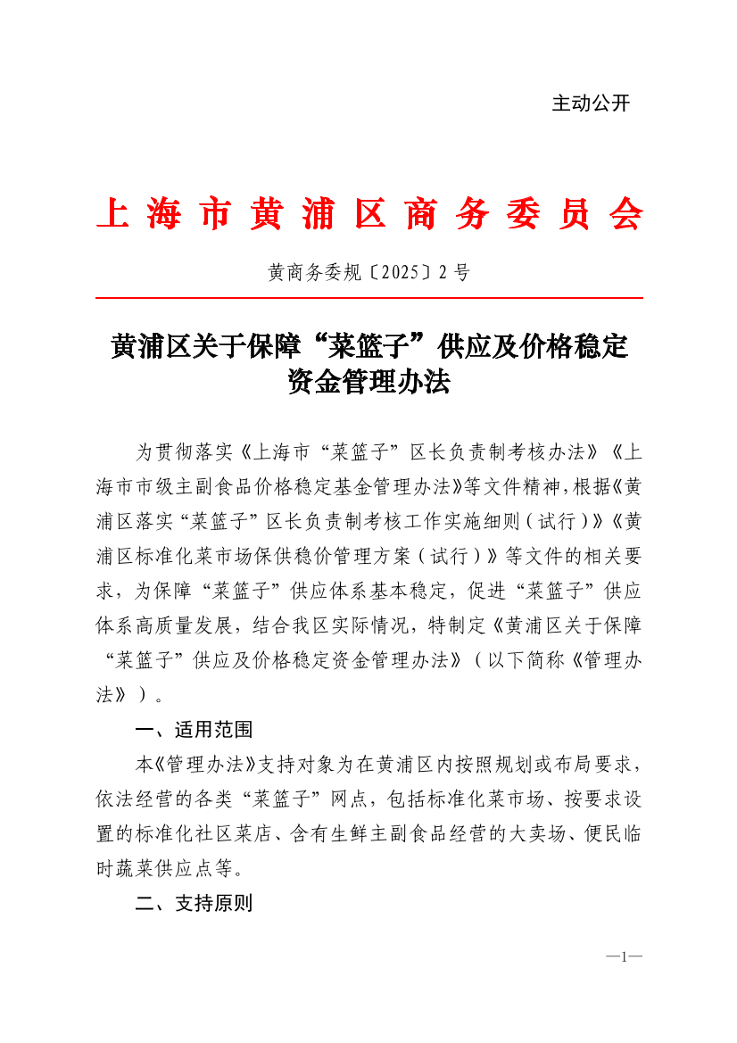 为贯彻落实《上海市“菜篮子”区长负责制考核办法》《上海市市级主副食品价格稳定基金管理办法》等文件精神,根据《黄浦区落实“菜篮子”区长负责制考核工作实施细则(试行)》《黄浦区标准化菜市场保供稳价管理方案(试行)》等文件的相关要求,为保障“菜篮子”供应体系基本稳定,促进“菜篮子”供应体系高质量发展,结合我区实际情况,特制定《黄浦区关于保障“菜篮子”供应及价格稳定资金管理办法》(以下简称《管理办法》)。