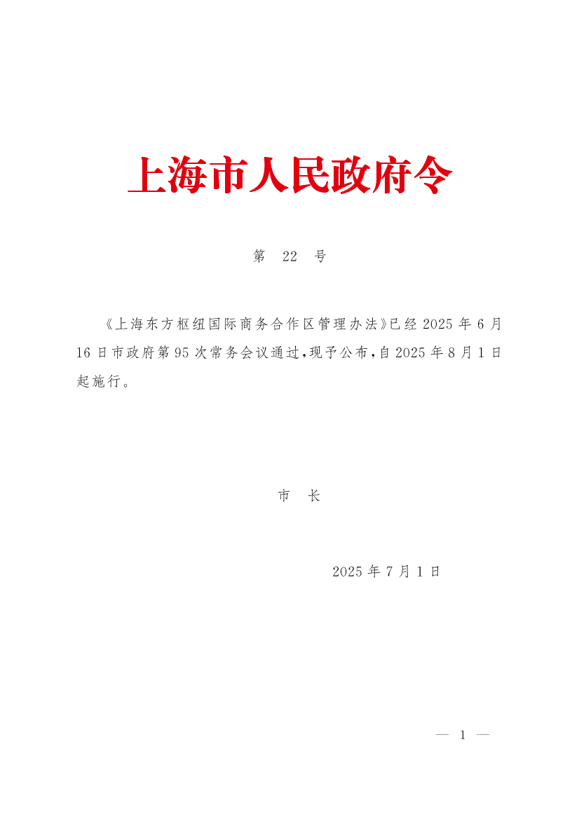 《上海东方枢纽国际商务合作区管理办法》已经2025年6月16日市政府第95次常务会议通过,现予公布,自2025年8月1日起施行。