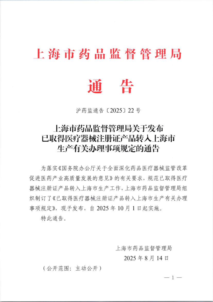 为落实《国务院办公厅关于全面深化药品医疗器械监管改革 促进医药产业高质量发展的意见》的有关要求,规范已取得医疗器械注册证产品转入上海市生产工作,上海市药品监督管理局组织制订了《已取得医疗器械注册证产品转入上海市生产有关办理事项规定》,现予发布,自2025年10月1日起实施。