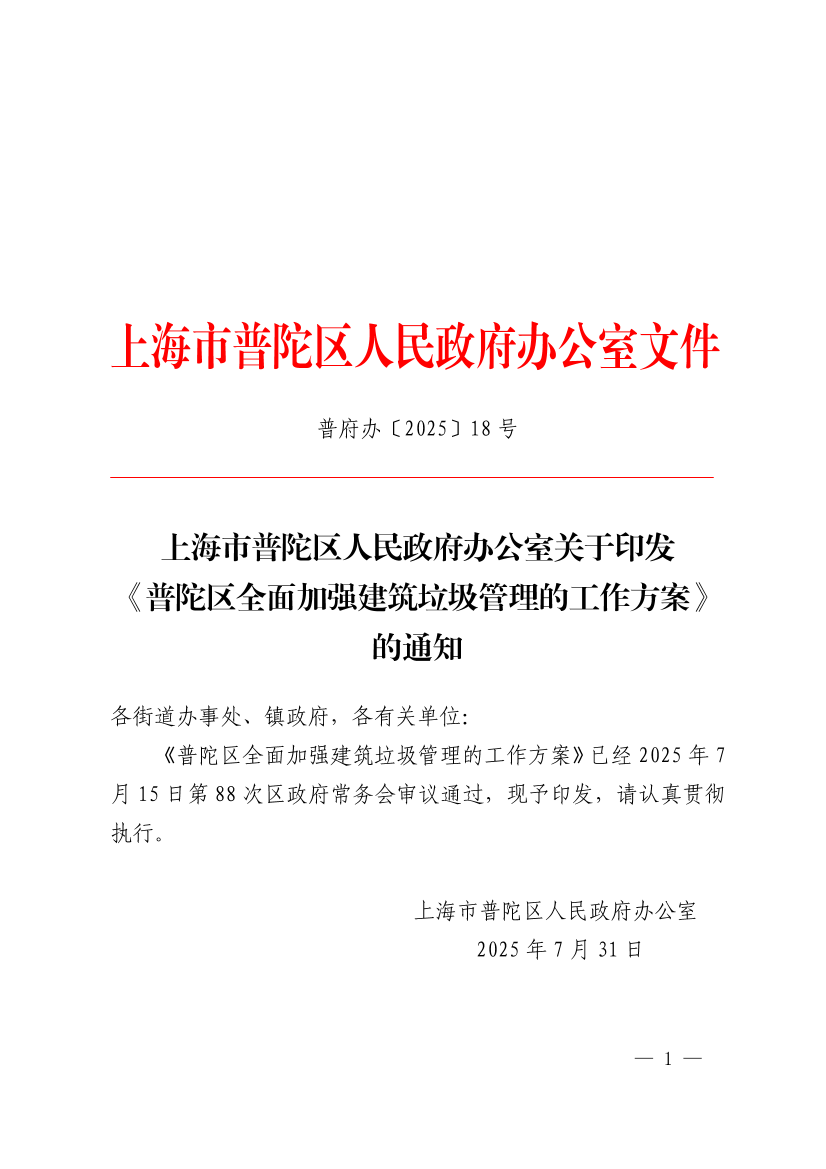 《普陀区全面加强建筑垃圾管理的工作方案》已经2025年7月15日第88次区政府常务会审议通过,现予印发,请认真贯彻执行。
