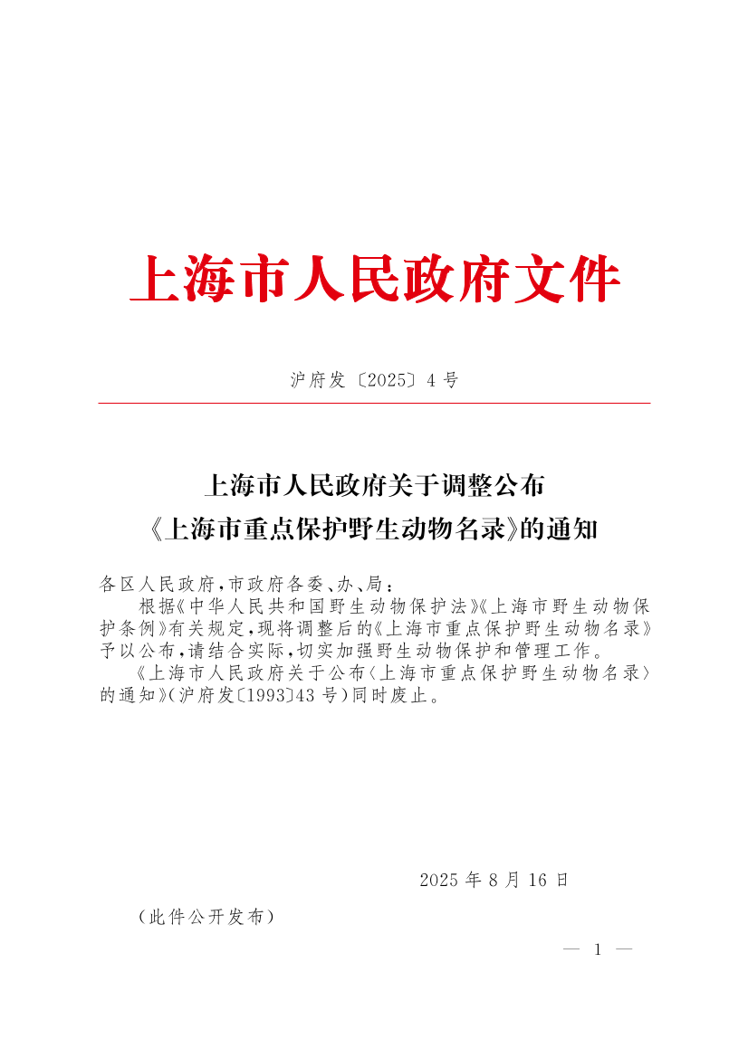 上海市人民政府关于调整公布《上海市重点保护野生动物名录》的通知