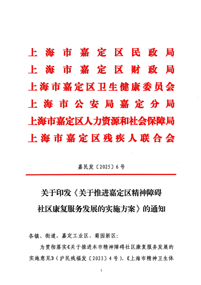 关于印发《关于推进嘉定区精神障碍社区康复服务发展的实施方案》的通知
