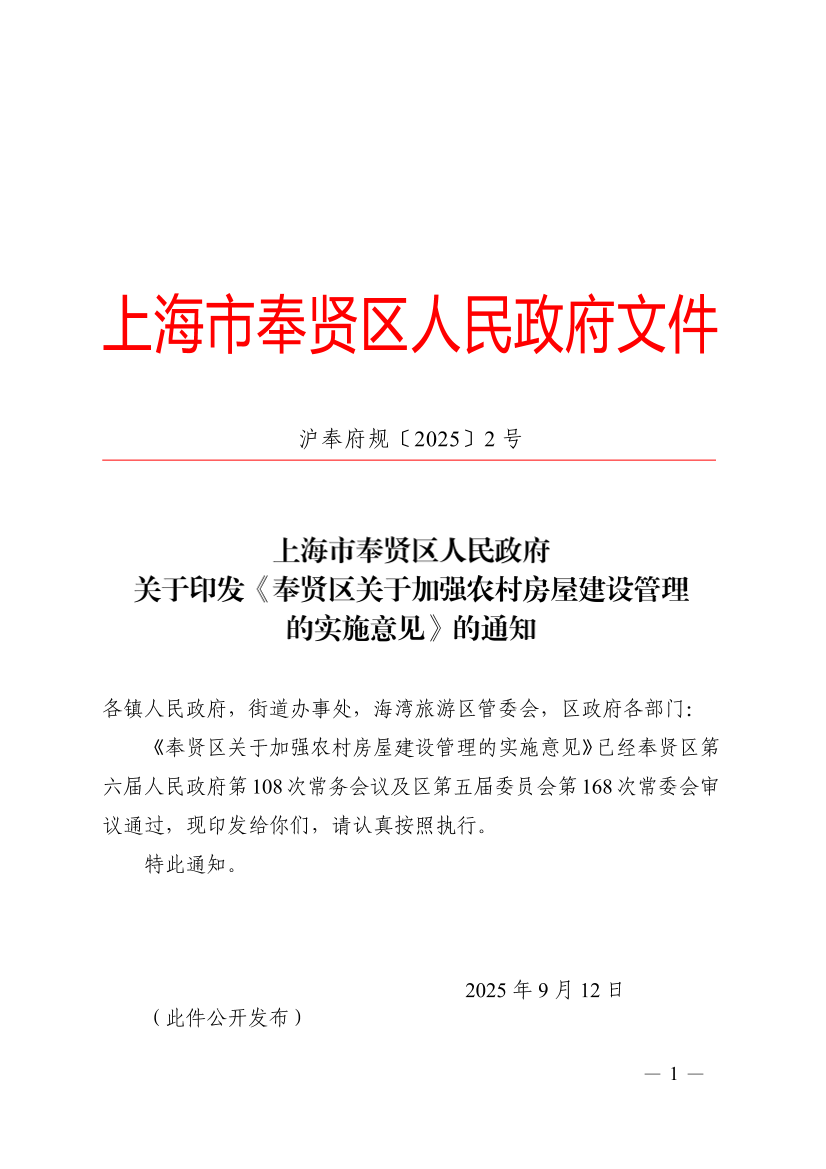 关于印发《奉贤区关于加强农村房屋建设管理的实施意见》的通知