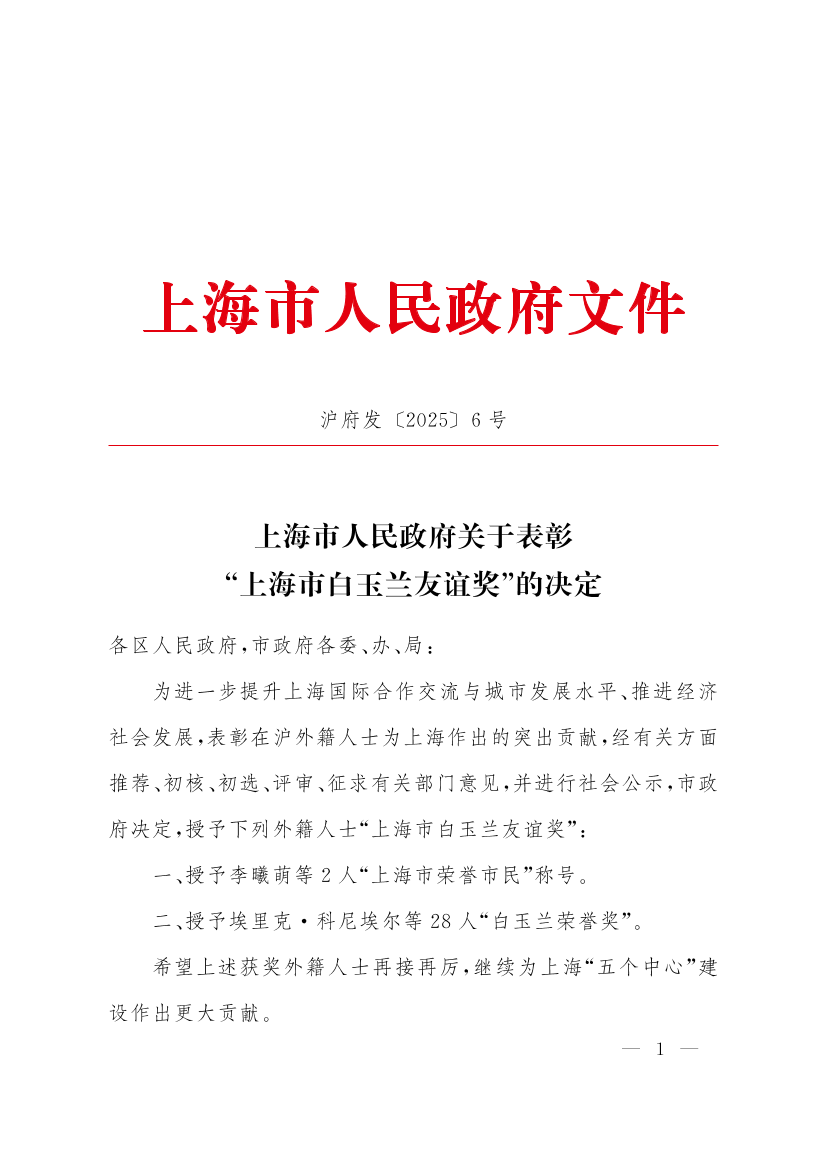 为进一步提升上海国际合作交流与城市发展水平、推进经济社会发展,表彰在沪外籍人士为上海作出的突出贡献,经有关方面推荐、初核、初选、评审、征求有关部门意见,并进行社会公示,市政府决定,授予下列外籍人士“上海市白玉兰友谊奖”: