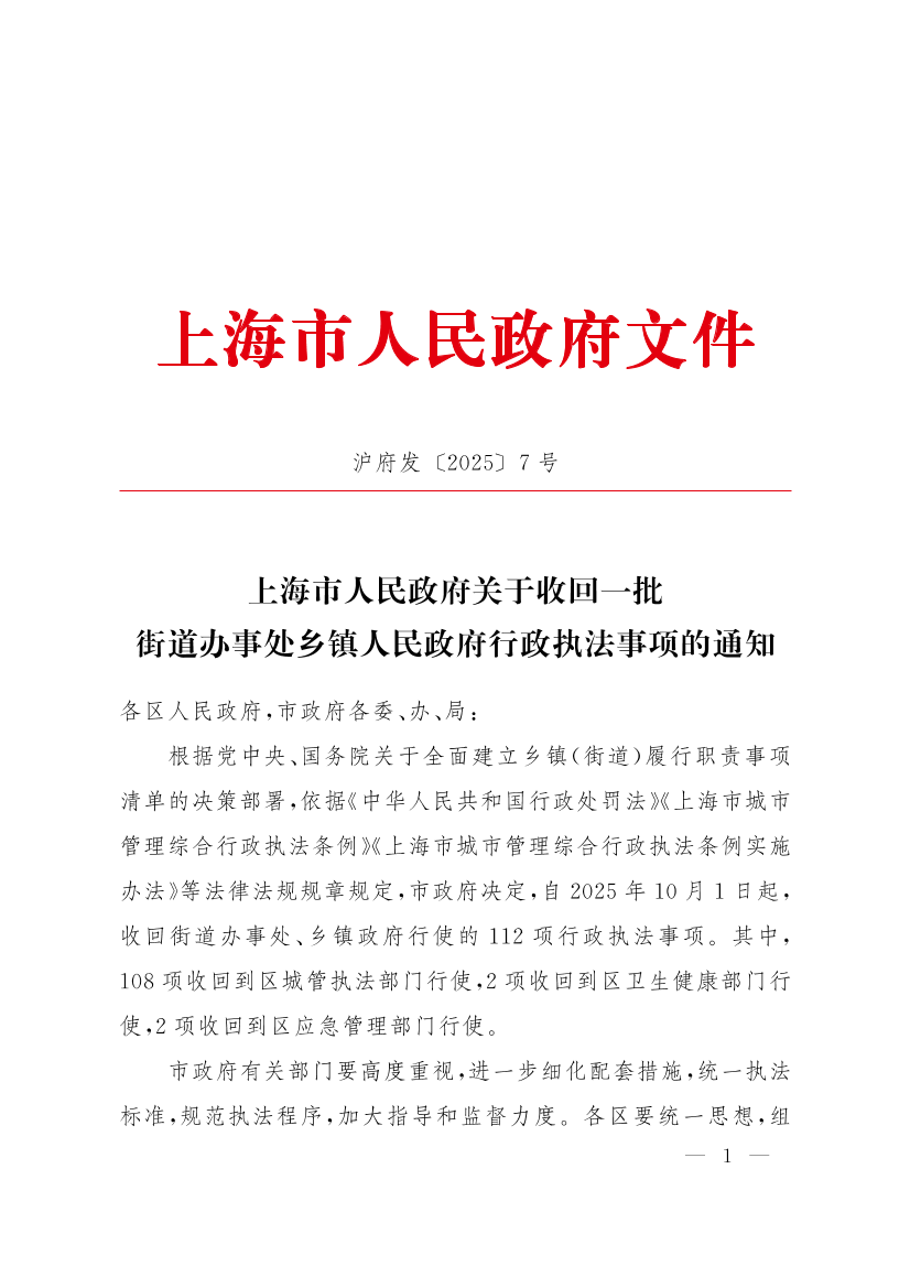 根据党中央、国务院关于全面建立乡镇(街道)履行职责事项清单的决策部署,依据《中华人民共和国行政处罚法》《上海市城市管理综合行政执法条例》《上海市城市管理综合行政执法条例实施办法》等法律法规规章规定,市政府决定,自2025年10月1日起,收回街道办事处、乡镇政府行使的112项行政执法事项。其中,108项收回到区城管执法部门行使,2项收回到区卫生健康部门行使,2项收回到区应急管理部门行使。