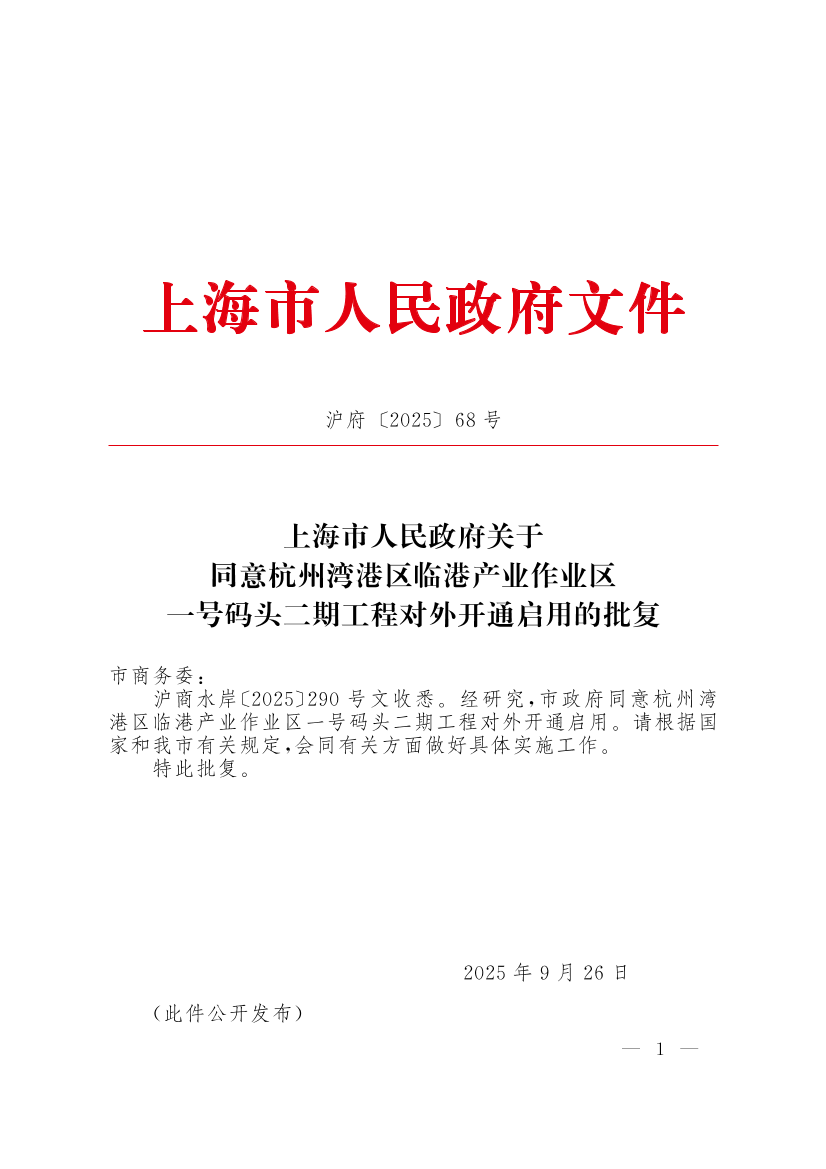 沪商水岸〔2025〕290号文收悉。经研究,市政府同意杭州湾港区临港产业作业区一号码头二期工程对外开通启用。请根据国家和我市有关规定,会同有关方面做好具体实施工作。