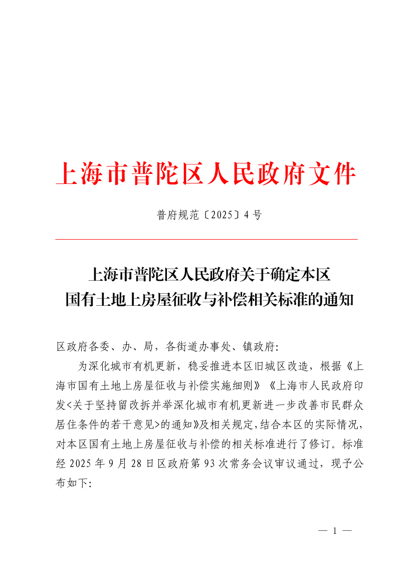 本通知自2025年10月10日起施行,有效期至2030年10月10日。2018年10月8日印发的《上海市普陀区人民政府关于确定本区国有土地上房屋征收与补偿相关标准的通知》(普府规范〔2018〕3号)、2023年9月28日印发的《关于延长<上海市普陀区人民政府关于确定本区国有土地上房屋征收与补偿相关标准的通知>有效期的通知》(普府规范〔2023〕3号)同时废止。