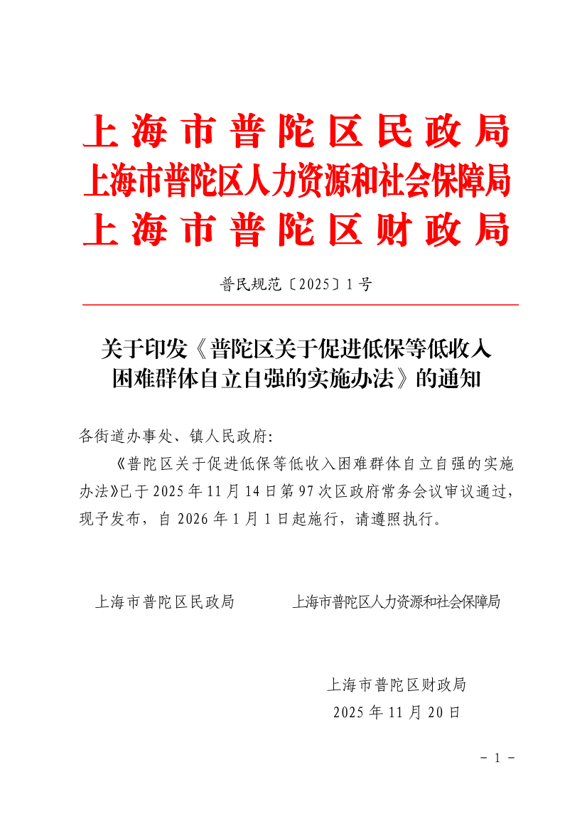 《普陀区关于促进低保等低收入困难群体自立自强的实施办法》已于2025年11月14日第97次区政府常务会议审议通过,现予发布,自2026年1月1日起施行,请遵照执行。