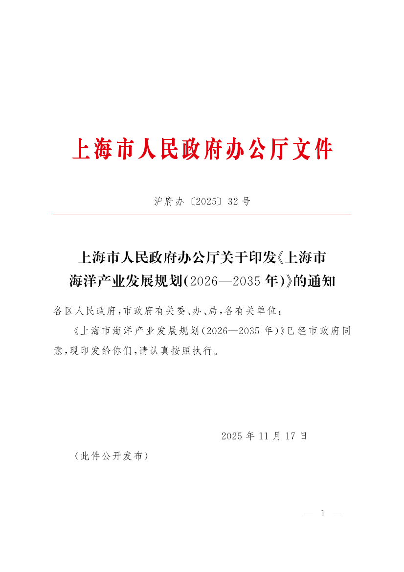 《上海市海洋产业发展规划(2026—2035年)》已经市政府同意,现印发给你们,请认真按照执行。